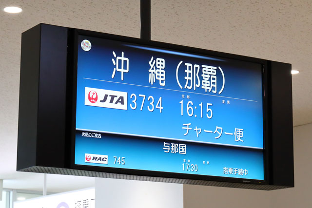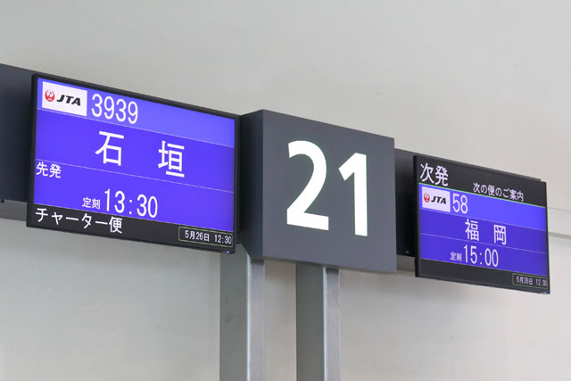 JTAの737-400退役チャーターNU3939便が出発する那覇空港21番搭乗口の出発案内=19年5月26日 PHOTO: Masahiro SATO/Aviation Wire