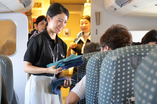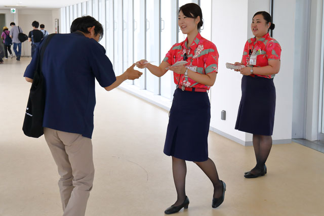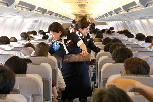 737-400退役チャーター機内でランチョンマットを配るJTAのスタッフ=19年5月26日 PHOTO: Masahiro SATO/Aviation Wire