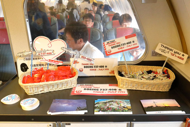 JTAの737-400退役チャーターのL1ドア横に置かれた記念品=19年5月26日 PHOTO: Masahiro SATO/Aviation Wire