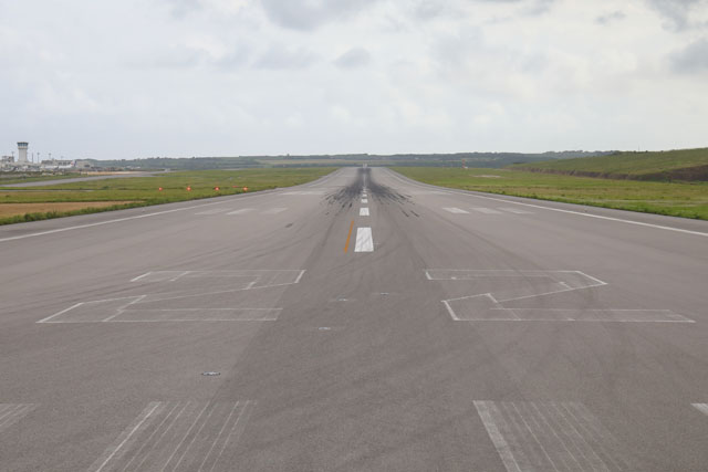2013年に役目を終えた旧空港の名物だった「急制動での着陸」を、現在の石垣空港で再現するとコックピットからアナウンスがあり、滑走路に接地と同時に急ブレーキで減速。駐機場へ通じる誘導路のずっと手前で減速を終え、ゆっくりと走行して8番スポット(駐機場)へ到着した。