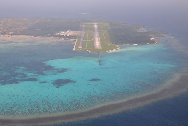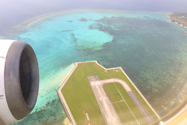 石垣を離陸後は、今年3月から24年ぶりに定期便が再開した下地島空港の上空へ。エメラルドグリーンの海を空から堪能した。
