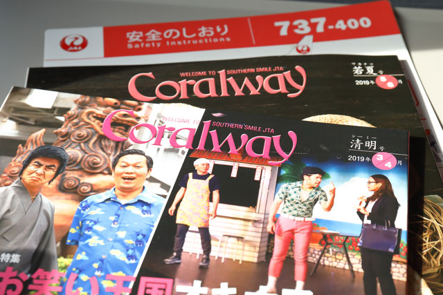 JTAの737-400退役チャーターのシートポケットに用意された機内誌「Coralway」=19年5月26日 PHOTO: Masahiro SATO/Aviation Wire