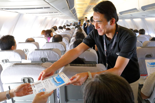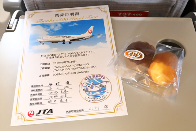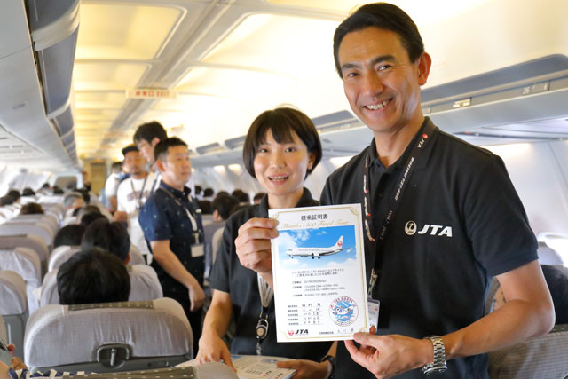 737-400退役チャーターNU3734便でツアー参加者に搭乗証明書を手渡すJTAの丸川社長=19年5月26日 PHOTO: Masahiro SATO/Aviation Wire