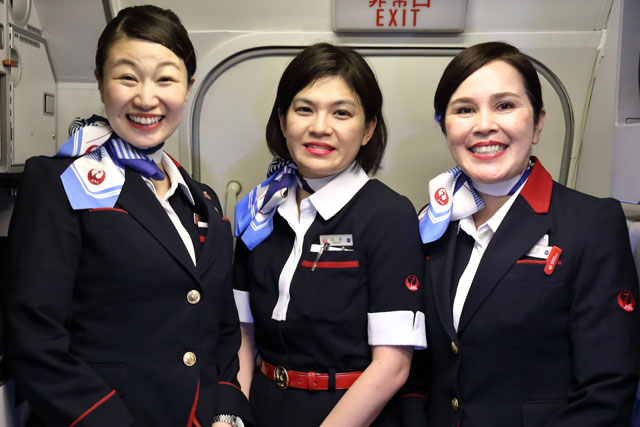 737-400退役チャーターに乗務したJTA客室乗務員の(左から)田中さんと牧野さんと服部さん=19年5月26日 PHOTO: Masahiro SATO/Aviation Wire