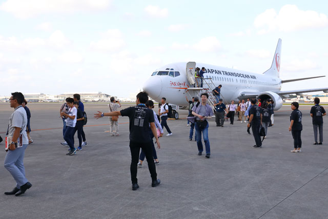 那覇空港102番スポットに到着したNU3734便から格納庫へ向かう参加者=19年5月26日 PHOTO: Masahiro SATO/Aviation Wire