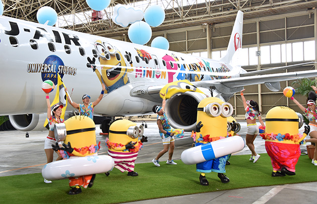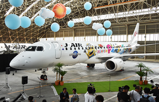 初便となったのは伊丹発新潟行きJL2247便で、今後は仙台や鹿児島、宮崎など18都市へのE190運航路線に投入。就航前の31日午前には、伊丹空港のジェイエア格納庫で就航イベントを開催し、ミニオンらが機体の前で踊って運航開始を祝った。