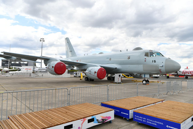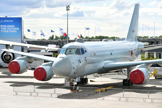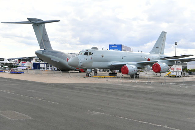 パリ航空ショー会場のル・ブルジェ空港で展示準備が進む海自P-1=19年6月15日 PHOTO: Tadayuki YOSHIKAWA/Aviation Wire