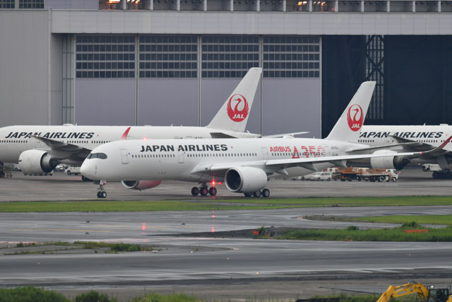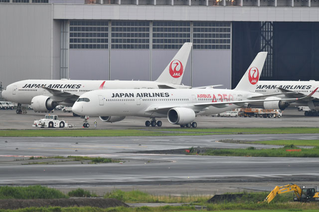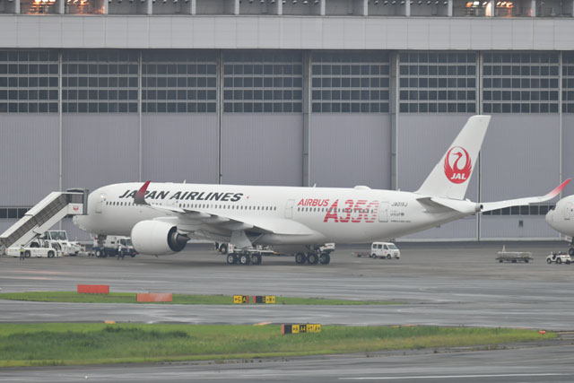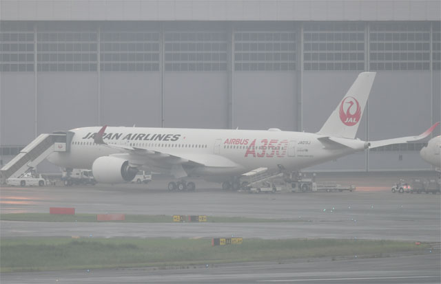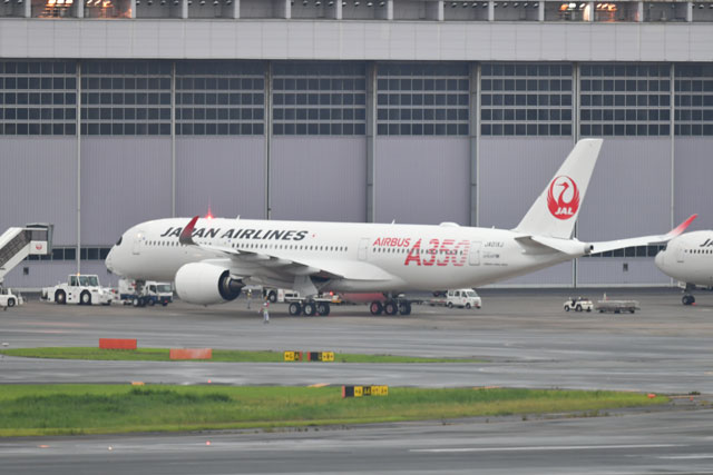 羽田で出発を待つJALのA350初号機=19年6月29日4時53分 PHOTO: Tadayuki YOSHIKAWA/Aviation Wire