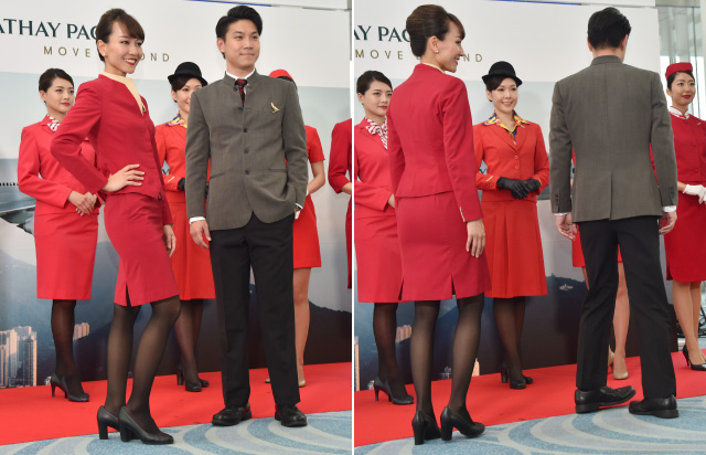 1999年からの現行9代目制服を着用するキャセイパシフィック航空の客室乗務員=19年7月4日 PHOTO: Yusuke KOHASE/Aviation Wire