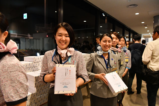 セレモニーではフラダンスなどが披露された後、鏡開きなどが行われた。午後7時20分ごろには搭乗が始まり、45番搭乗口から大量の乗客が機内へ向かう。搭乗口を通過すると、機体が見える窓の近くでANAの平子裕志社長らが乗客を見送り、地上係員が記念品を手渡していた。ランプに目をやると、トーイングカーにはウミガメのイラストが飾られていた。普段は初便をランプから取材する立場なので、PBB(搭乗橋)側からの景色は少々不思議なものであった。