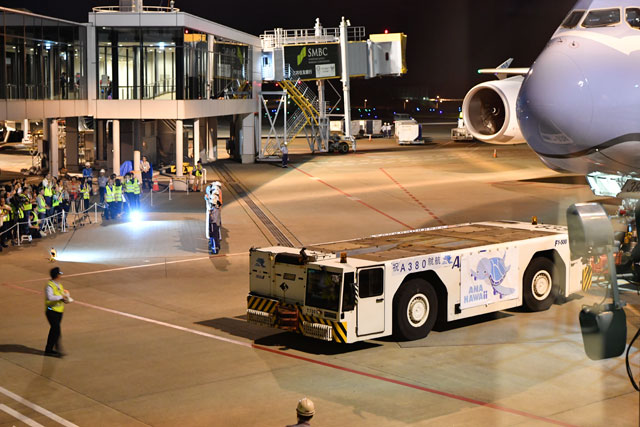 ANAのA380、ホノルルへ 搭乗橋など現地確認(19年4月17日)
