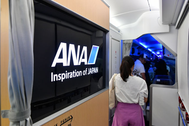 機内に入ると、ANAのロゴが目に入る。海外の航空会社では、こうしたドア付近のデザインで自社の色を出すところが増えてきた。機内の第一印象が決まる場でもあるので、日系の航空会社も今後こうした内装が増えていくだろう。ギャレー(厨房設備)もカバーが掛けられており、これまでのような武骨な印象とはかなり違った。