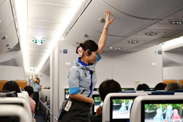 ANAのA380初便ホノルル行きNH184便の出発時にオーバーヘッドビンを点検する客室乗務員=19年5月24日 PHOTO: Tadayuki YOSHIKAWA/Aviation Wire
