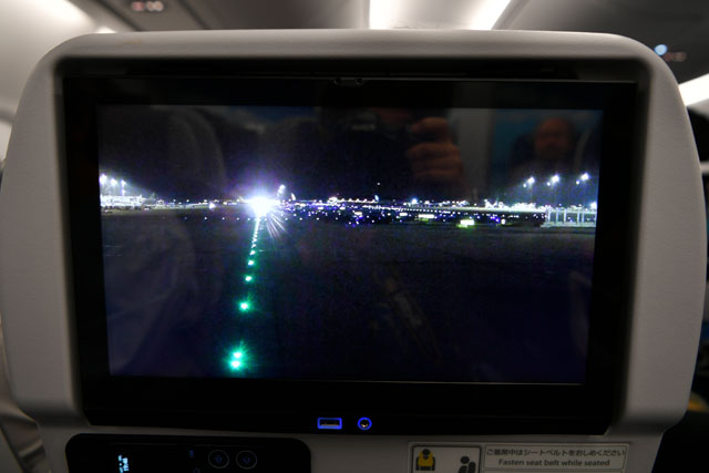 個人用モニターで楽しめるコンテンツの一つが、機外カメラだ。最近のエアバス機は機体前方を映す従来のカメラ位置に加えて、垂直尾翼から機体を俯瞰(ふかん)する映像も楽しめる。この垂直尾翼のカメラは他社のA380も採用済みだが、ほかの機体よりも窓から遠い席のあるA380には良いサービスだと思う。実際、多くの乗客がカメラ映像で離陸の様子を楽しんでいた。