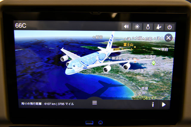 ANAのA380エコノミークラスの個人用モニターに映し出された機体=19年5月24日 PHOTO: Tadayuki YOSHIKAWA/Aviation Wire