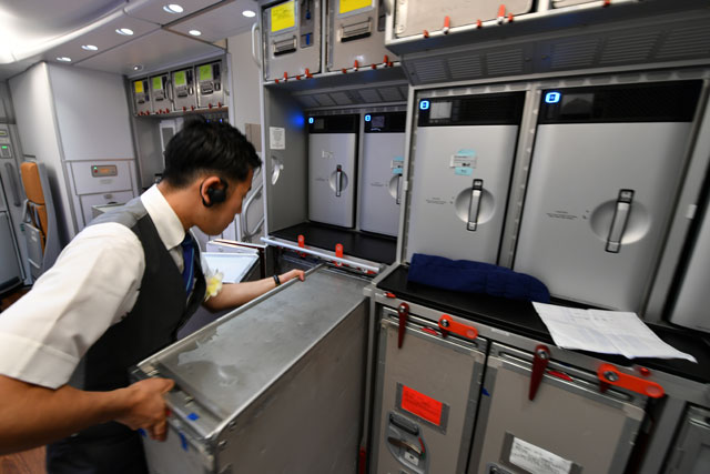 A380初便のギャレーで機内食やドリンクを準備する客室乗務員の曽我部さん=19年5月24日 PHOTO: Tadayuki YOSHIKAWA/Aviation Wire