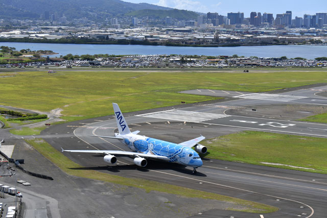 ホノルルのダニエル・K・イノウエ空港の滑走路に進入するANAのA380初号機。いよいよ夏の繁忙期を迎える=19年7月2日 PHOTO: Tadayuki YOSHIKAWA/Aviation Wire