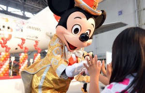 就航前の29日午前に東京・羽田の格納庫で行われたお披露目イベントには、地元大田区の小学生が招かれ、サプライズで登場したミッキーマウスなどに喜んでいた。