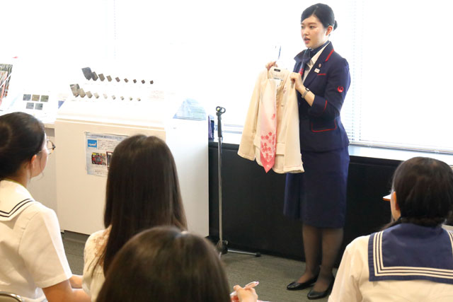 中高生を対象にしたJALの航空教室でラウンジ係員のジャケットを手に生徒の質問に答える地上係員の男澤さん=19年8月9日 PHOTO: Masahiro SATO/Aviation Wire
