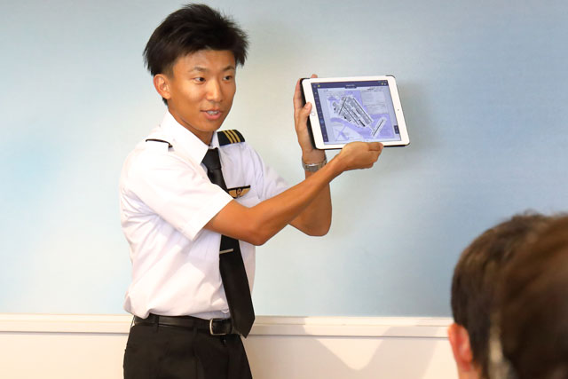 中高生を対象にしたJALの航空教室でiPadを見せながら生徒の質問に答えるパイロットの米谷さん=19年8月9日 PHOTO: Masahiro SATO/Aviation Wire