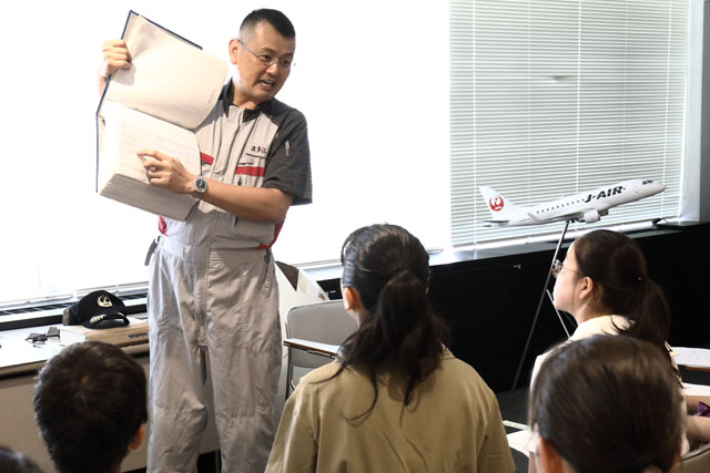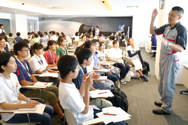 中高生を対象にしたJALの航空教室で生徒の質問に答える整備士の波多江さん