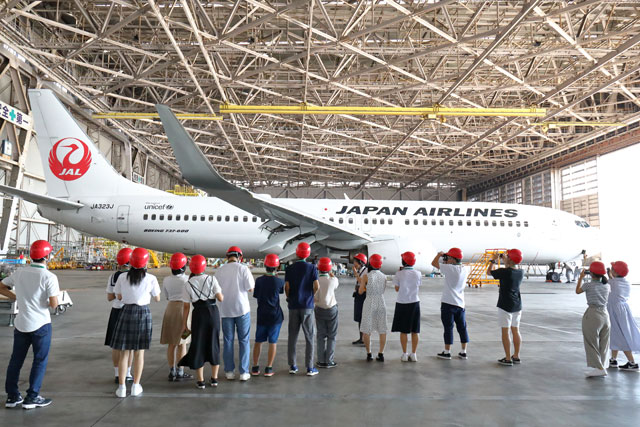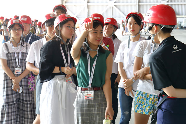 中高生を対象にしたJALの航空教室で格納庫の見学をする生徒たち=19年8月9日 PHOTO: Masahiro SATO/Aviation Wire