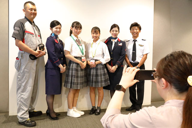 生徒たちは講義を受講後、歴代制服やさまざまな史料を展示する「スカイミュージアム」や格納庫を見学。飛行機や働く整備士を間近に見られるとあって、持参したスマートフォンのカメラで撮影を楽しんでいた。