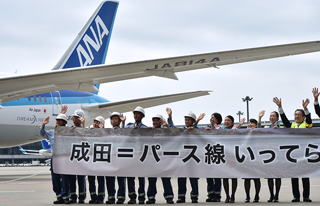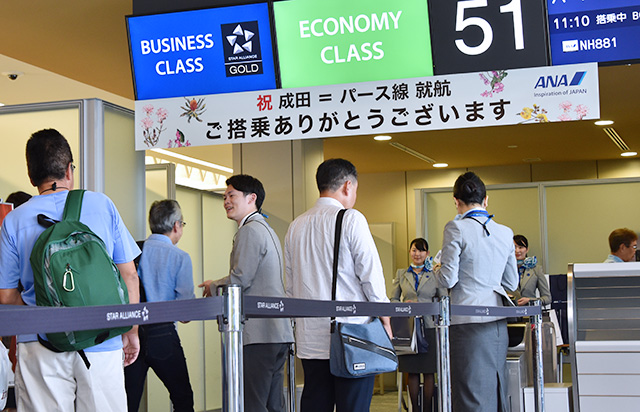 初便となったパース行きNH881便が出発した成田空港第1ターミナル51番搭乗口前で記念セレモニーを開催。ANAの平子裕志社長は「(シドニーなどの)東海岸とは異なり、インド洋に沈む夕陽はパースにしかない。西海岸ならではの夕陽を楽しんで」と述べた。平子社長によると、パース線の10月までの2カ月間の予約率は70%を超えているという。「西オーストラリアへの関心の高さがうかがえる」と語り、満足した様子を見せた。