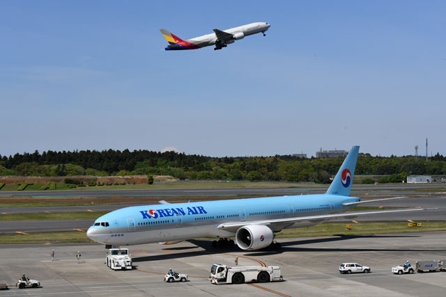 大韓航空(下)とアシアナ航空。両社とも一部日本路線を運休・減便する(資料写真)=PHOTO: Tadayuki YOSHIKAWA/Aviation Wire