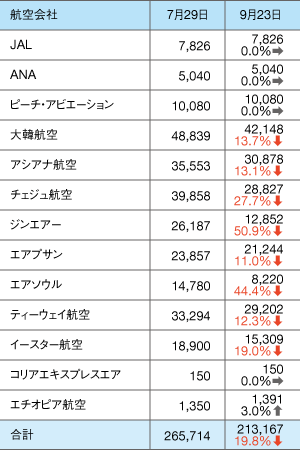 日本と韓国の両国関係の悪化に伴い、両国間路線の提供座席の減少が止まらない。韓国の文在寅大統領による法治国家の概念や国際ルールを無視した対日政策などの影響による日韓関係悪化に伴うもので、7月29日の週に26万5714席だった1週間あたりの片道の提供座席数は、8週間後の9月23日には19.8%減の21万3167席となる見通しで、230便以上が運休となる見込み。