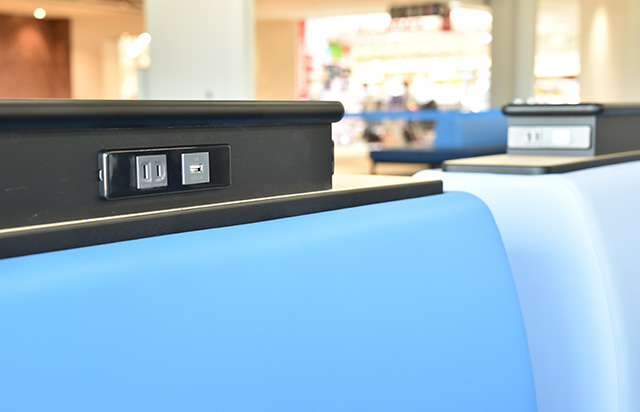 中部空港LCCターミナルの国際線搭乗エリアにある休憩スペースに備える電源類=19年9月17日 PHOTO: Yusuke KOHASE/Aviation Wire