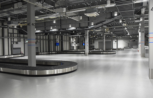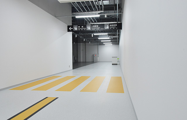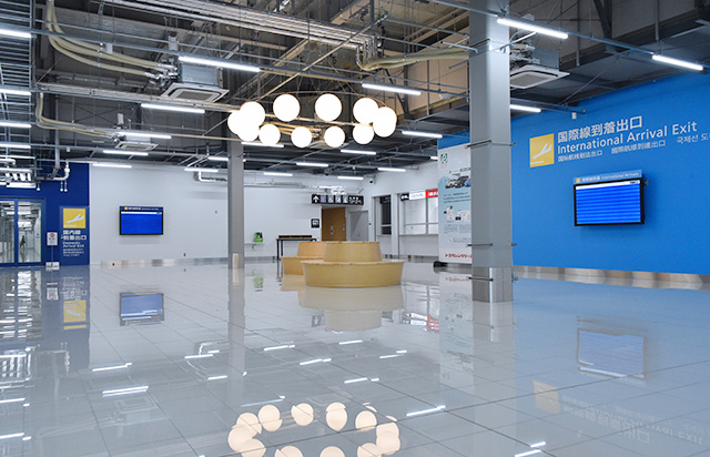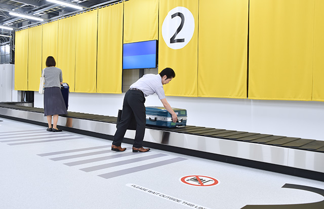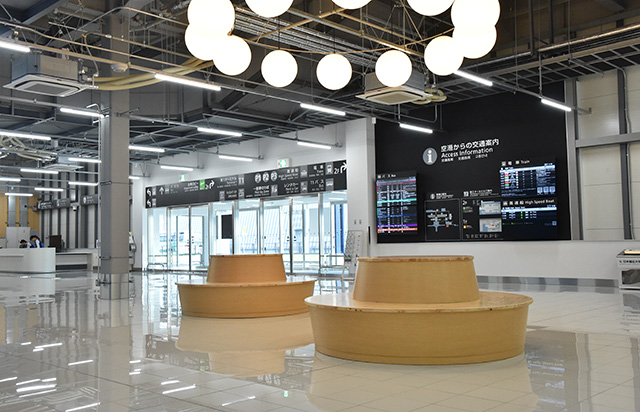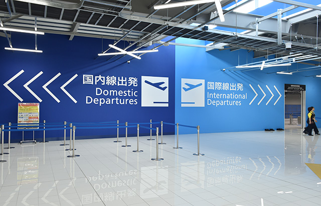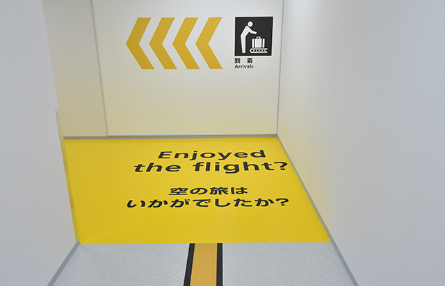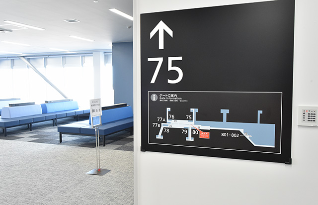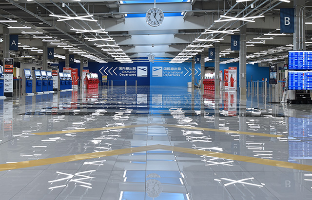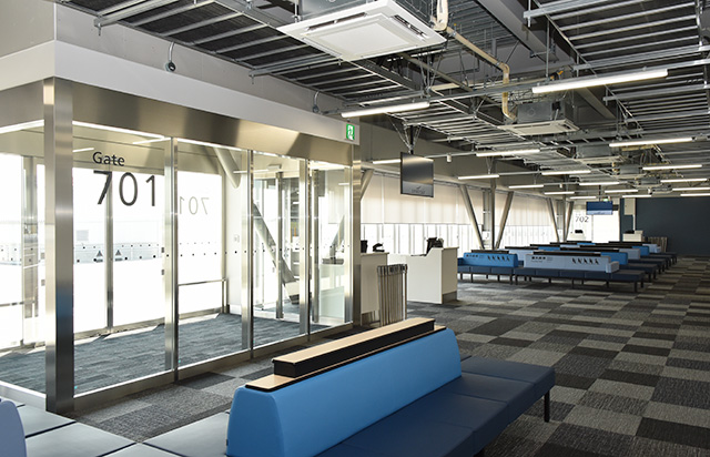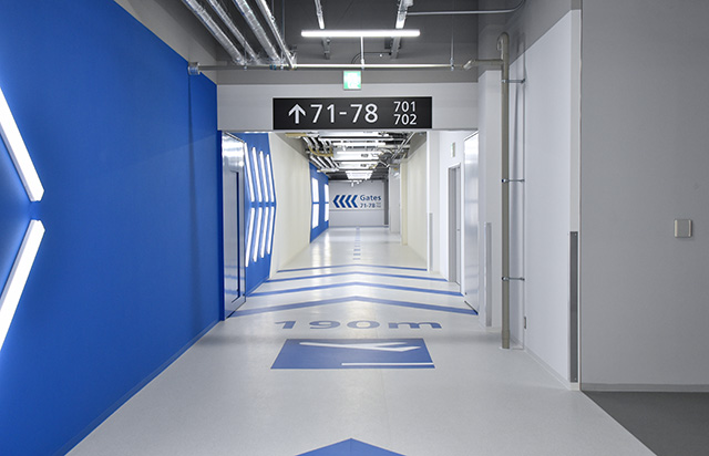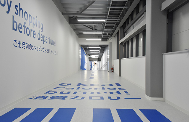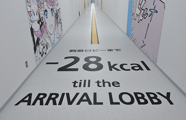 出発ロビーは滑走路をイメージしたデザインを採用。到着ロビーには和のデザインを取り入れ、カジュアルな旅を演出する。出発ゲートへの通路や到着時の手荷物受取所までの通路には「到着ロビーまで-28kcal」など消費カロリーを表示し、楽しみながら歩ける工夫も取り入れた。