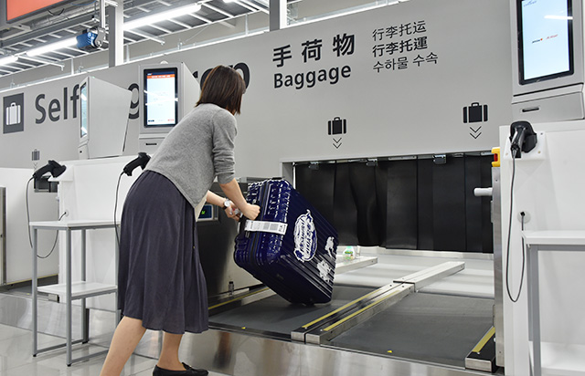 受託手荷物の預け入れ手続きをする乗客役のスタッフ=19年9月17日 PHOTO: Yusuke KOHASE/Aviation Wire
