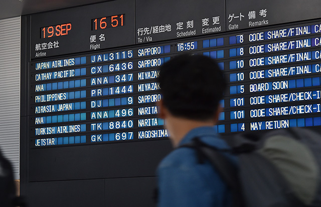 現ターミナルから出発するエアアジアとジェットスターの最後の国内線を表示する中部空港の出発案内=19年9月19日 PHOTO: Yusuke KOHASE/Aviation Wire