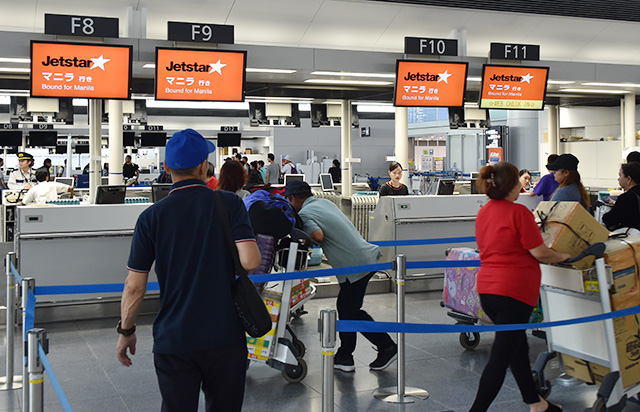 現ターミナルからの最終出発便へのチェックインを進めるジェットスター・ジャパンのマニラ行きの利用客=19年9月19日 PHOTO: Yusuke KOHASE/Aviation Wire