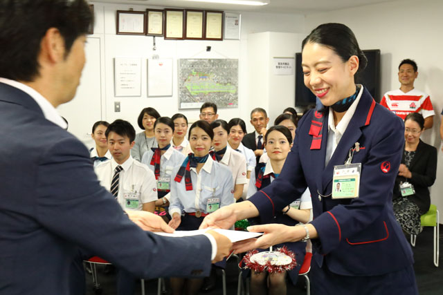 伊丹空港で開かれたJALの空港サービスコンテストで優勝し賞状が贈られる小田さん=19年9月27日 PHOTO: Masahiro SATO/Aviation Wire