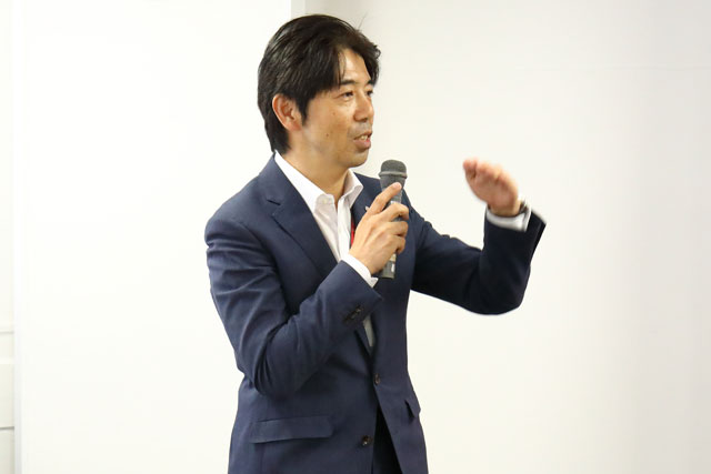 伊丹空港で開かれたJALの空港サービスコンテストの審査を終え講評するJALスカイ大阪の園田武史社長=19年9月27日 PHOTO: Masahiro SATO/Aviation Wire