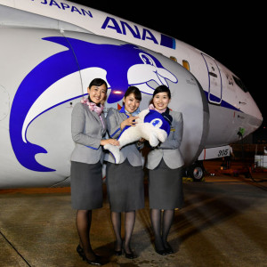 ドルフィンが描かれた737-500のエンジン前に並ぶANAウイングスの客室乗務員=19年9月28日 PHOTO: Tadayuki YOSHIKAWA/Aviation Wire
