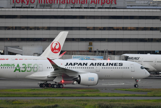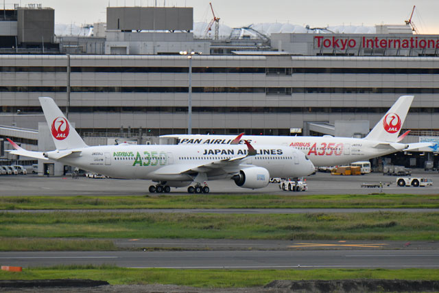 福岡行きJL303便として羽田のD滑走路へ向かうJALのA350-900 3号機(手前)=19年10月7日 PHOTO: Tadayuki YOSHIKAWA/Aviation Wire