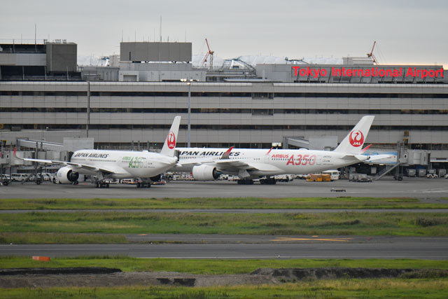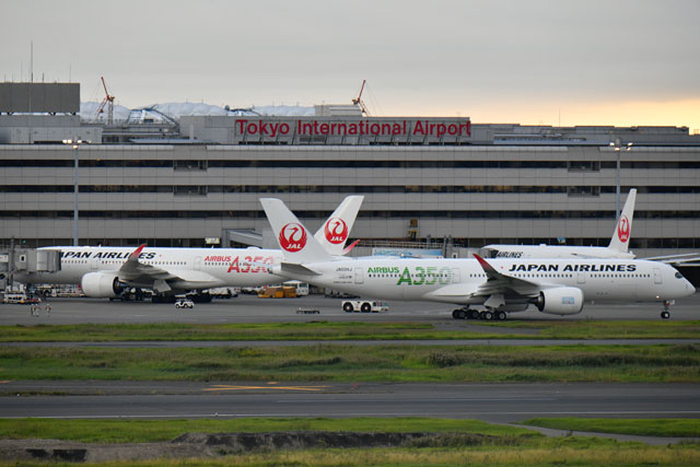 初の商業運航となる福岡行きJL303便として羽田で出発を待つJALのA350-900 3号機(左)と福岡行きJL307便として出発を待つ初号機(中央)=19年10月7日 PHOTO: Tadayuki YOSHIKAWA/Aviation Wire