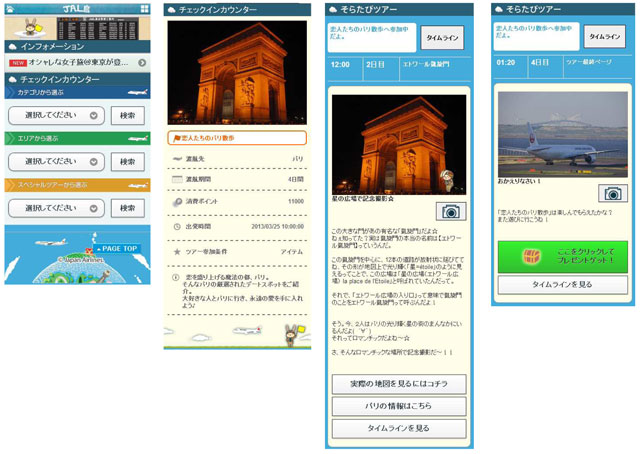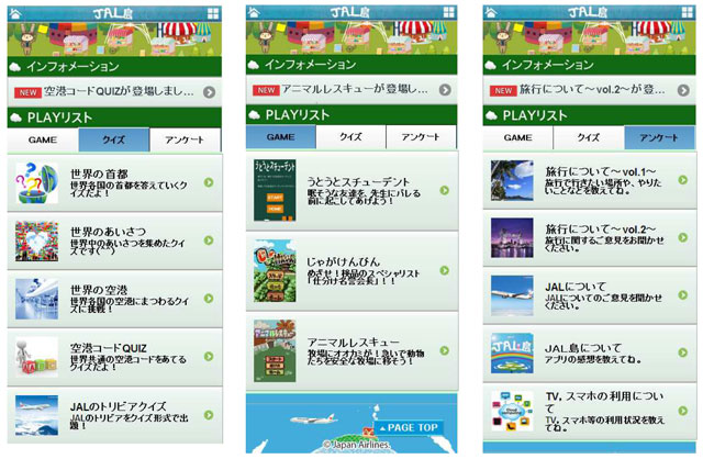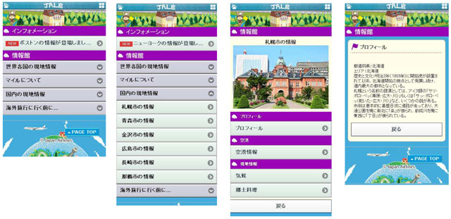 旅の情報館では、世界各地の空港や現地情報を提供。海外旅行の準備に役立つ情報や、JALのマイル活用法などのコンテンツを用意する。イベント広場では、ミニゲームやクイズ、アンケートを実施し、アプリ内で使えるポイントを貯めるとプレゼントなどと交換できる。