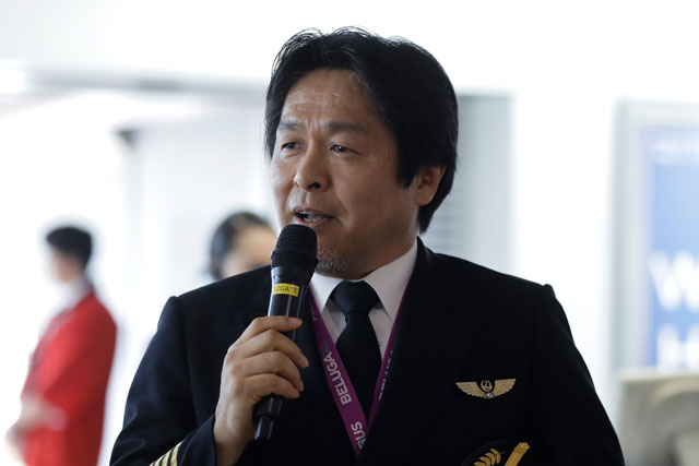 新千歳空港でA350就航を記念してあいさつするJALの大西信幸機長=19年10月27日 PHOTO: Kiyoshi OTA/Aviation Wire
