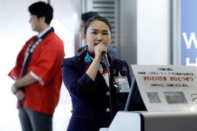 新千歳空港で開かれたA350就航記念式典でアナウンスするJALの地上係員=19年10月27日 PHOTO: Kiyoshi OTA/Aviation Wire