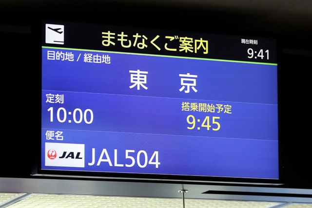 JALの新千歳発A350初便となる羽田行きJL504便の搭乗案内を示す案内表示板=19年10月27日 PHOTO: Kiyoshi OTA/Aviation Wire