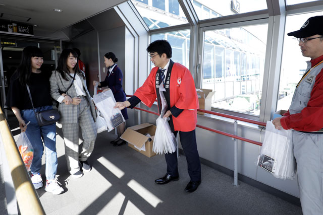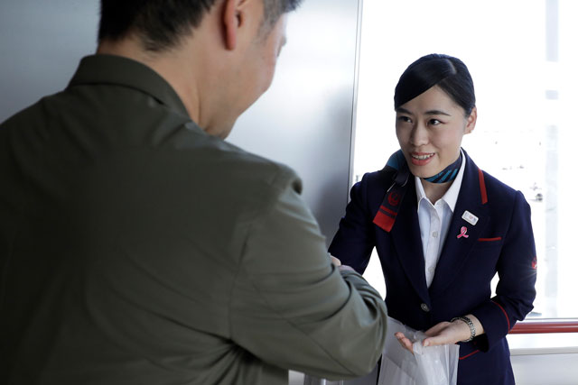 新千歳発のA350初便となる羽田行きJL504便の乗客に記念品を手渡すJALの地上係員=19年10月27日 PHOTO: Kiyoshi OTA/Aviation Wire