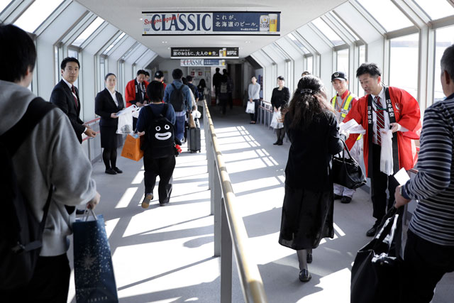 新千歳発のA350初便となる羽田行きJL504便の乗客に記念品を手渡すJAL社員ら=19年10月27日 PHOTO: Kiyoshi OTA/Aviation Wire