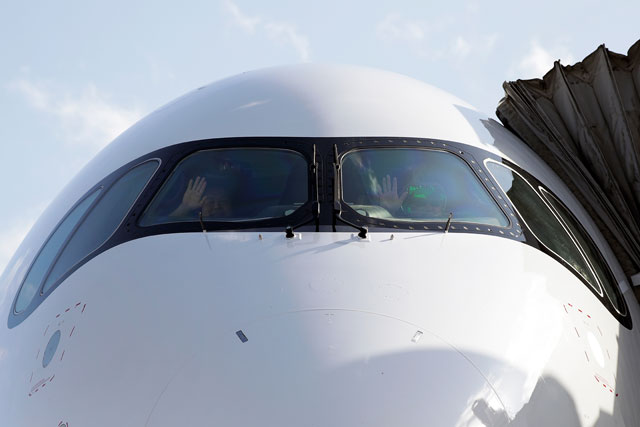 新千歳空港でA350のコックピットから手を振るJALの大西信幸機長ら=19年10月27日 PHOTO: Kiyoshi OTA/Aviation Wire