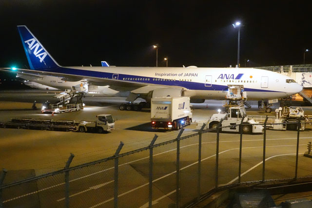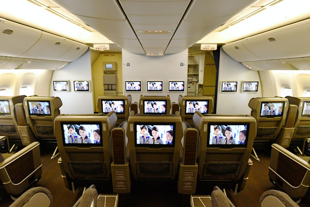 私が復路で搭乗したのは、NH82便の2G席で中央3席右側の通路席。周囲を見渡すと満席で、土曜日とあってか観光客が多いようだった。777-200新仕様機の座席数は2クラス392席(現行は405席)でプレミアムクラス28席(同21席)と普通席364席(同384席)と、プレミアムが増えて普通席が減る構成なので、需要が弱含みの時期でも客単価が高いプレミアムクラスが満席になれば、アップグレード客もいるとはいえ、1便あたりの収支は増収につながるだろう。