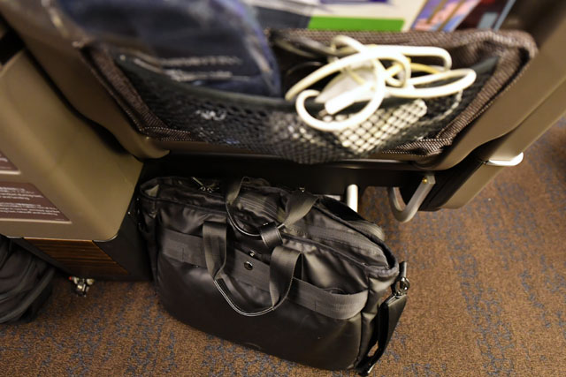 ビジネスバッグをヨコ向きに置いたANAの新プレミアムクラスの足もと。出発前にオーバーヘッドビンにしまった=19年11月16日 PHOTO: Tadayuki YOSHIKAWA/Aviation Wire