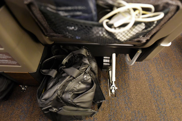 ビジネスバッグをタテ向きに置いたANAの新プレミアムクラスの足もと。出発前にオーバーヘッドビンにしまった=19年11月16日 PHOTO: Tadayuki YOSHIKAWA/Aviation Wire